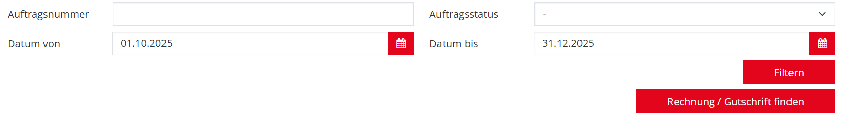 - Hinweis: Sie können Rechnungen filtern, nach Auftragsnummer, Auftragsstatus und Datum. Klicken Sie nach der Eingabe auf Filtern, um die Rechnungen anzuzeigen. Über das den Button Rechnung / Gutschrift finden können Sie nach einzelnen Rechnungen / Gutschriften suchen, geben Sie dafür die Rechnungsnummer oder Gutschriftnummer (mindestens 8 Zeichen) in das Suchfenster ein.